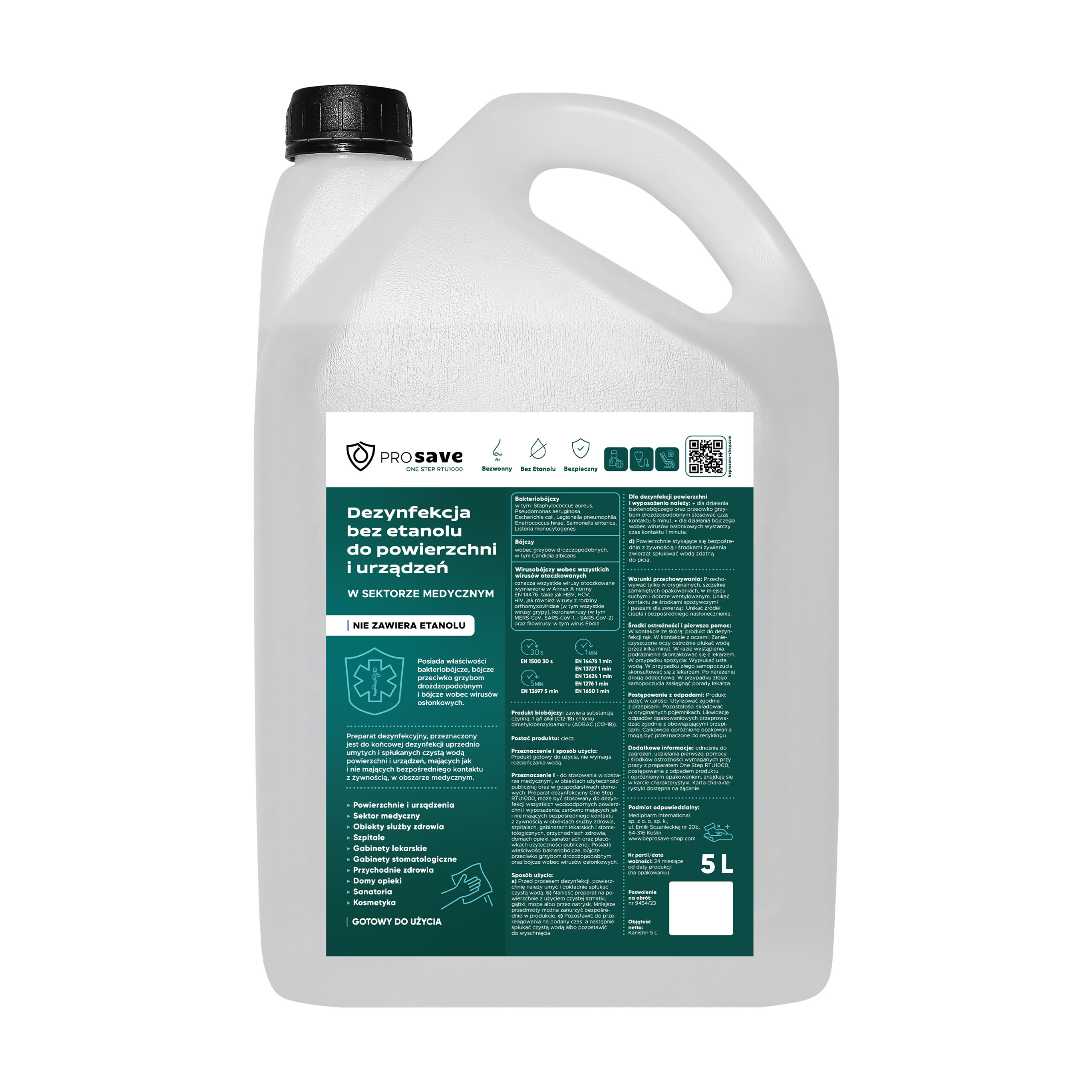 Płyn do dezynfekcji stosowany do częstego użycia na powierzchnie i urządzenia w sektorze medycznym i wszystkich obiektach służby zdrowia, takich jak szpitale, gabinety lekarskie, gabinety stomatologiczne, przychodnie zdrowia, domy opieki, sanatoria, gabinety kosmetyczne.Produkt nie zawiera etanolu. W karcie charakterystyki w sekcji 2.2 brak zagrożeń. Nie zawiera barwników. Nie zawiera alkoholu. Przebadany dermatologicznie, nie powoduje reakcji alergicznych. Produkt biobójczy. Produkt nie jest łatwopalny.